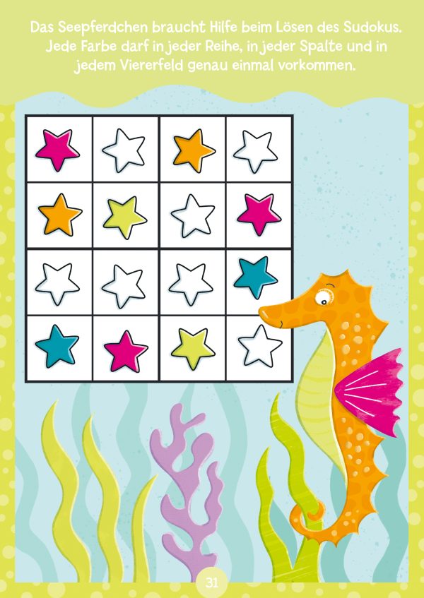 - Viele abwechslungsreiche Rätselarten – Labyrinthe, Paare finden, Finde den Unterschied, Zählen, Malen nach Symbolen u. v. m.