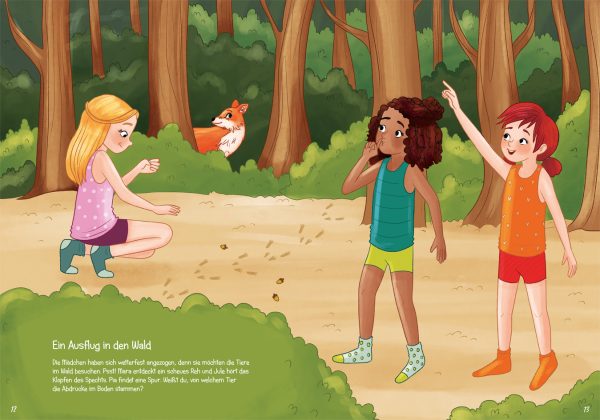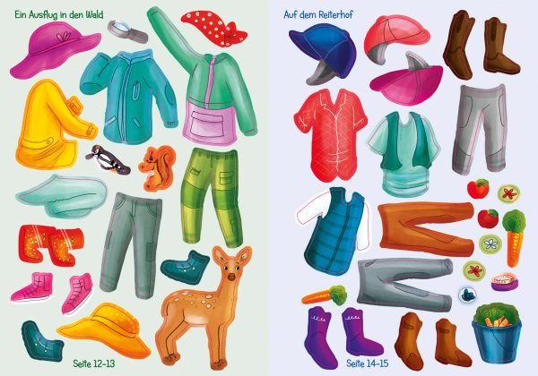 In diesem liebevoll illustriertem Sticker-Anziehbuch begleiten Kinder drei Freundinnen beim Besuch der Hundeschule und Tierarztpraxis, beim Picknick auf der Blumenwiese, der Waldwanderung oder beim Ausflug auf die Alpakafarm und den Bauernhof. Passend für jede Gelegenheit präsentieren die über 200 Sticker Kleidungsstücke, Accessoires und viele Tiere. Die bunten Aufkleber mit fröhlich herumtollenden Hunden, süßen Kaninchen oder scheuen Waldtieren können Kinder ab 6 Jahren auf den großformatigen Szenen verteilen und die Seiten so aktiv mitgestalten. Eine schöne Beschäftigung für zu Hause oder unterwegs.