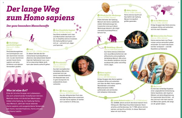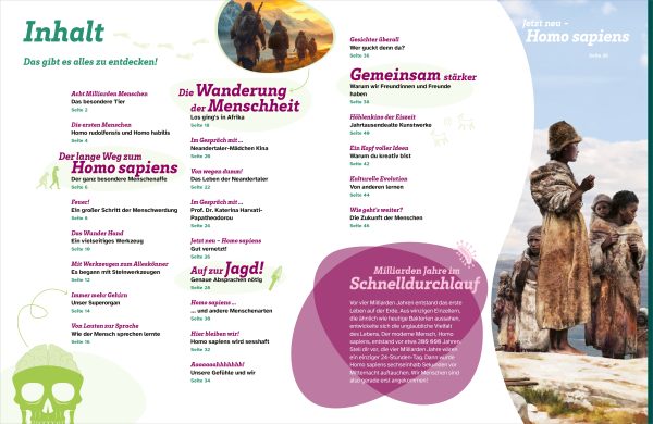 Wie sind wir Menschen eigentlich zu dem geworden, was wir heute sind? Vor einigen Millionen Jahren gingen die ersten Menschen dauerhaft aufrecht und stellten Werkzeuge her. Schließlich entstand Homo sapiens, der moderne Mensch. Was machte Homo sapiens so erfolgreich? Warum überlebten wir – und nicht die Neandertaler? Und wie veränderten Sprache, Erfindungen und soziale Strukturen unsere Welt? Von der Steinzeit bis in die Gegenwart gehen wir auf eine spannende Zeitreise durch die Entwicklung der Menschheit. Und eines ist sicher: Unsere Geschichte ist noch lange nicht zu Ende!