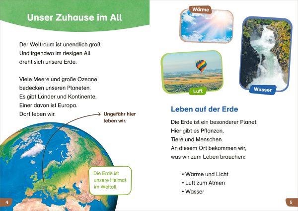 Die Erde ist unser Platz im Weltall. Seit Millionen von Jahren entwickeln sich Pflanzen, Lebewesen und auch die Erde selbst. Die Kontinentalplatten, das Salz- und Süßwasserwasser, die Atmosphäre – alles ist im Wandel. Leseanfängerinnen und Leseanfänger erfahren, wie die Erde aufgebaut ist, welche Kontinente und Ozeane es gibt und wie Vulkane entstehen. Wie fügt sich die Erde ins Sonnensystem ein und welche Bedeutung hat der Mond? Mit schönen Bildern, großer Schrift und einfachen Sätzen macht das Lesenlernen richtig Spaß. Geeignet für Grundschulkinder ab der 1. Klasse. Ein tolles Geschenk für den Schulanfang!