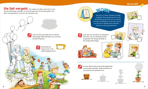 Jahreszeiten, Wochentage, Uhrzeit: Alles zu verstehen, ist gar nicht so einfach. Aber mit dem Mitmach-Heft Uhr und Zeit verstehen lernen die Kinder mit Rätseln, Stickern und Ausmalbildern spielerisch und unterhaltsam die verschiedenen Formen der Zeiten. Welcher Wochentag kommt als nächstes? Welches Stickerbild gehört zur gezeigten Jahreszeit? In welcher Reihenfolge wächst eine Pflanze? Ein zusätzliches Lesevergnügen liefert die lustige Bildergeschichte – mit Icons für Erstleser*innen.