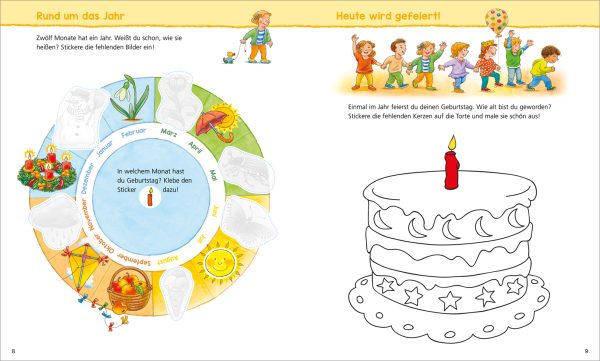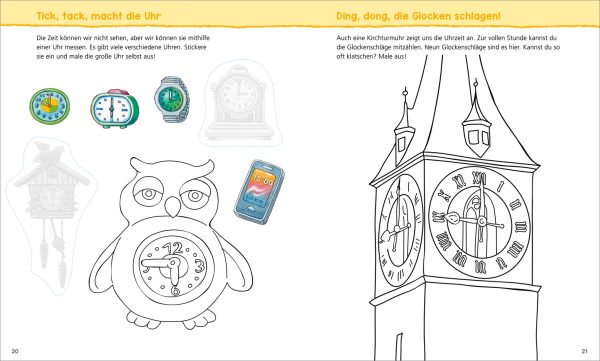 Die Zeit hat keine Farbe, keinen Geruch, man kann sie nicht anfassen, aber ist sie immer da. Das ist für Kinder häufig schwer zu verstehen. Dieses Heft aus der Reihe „WAS IST WAS Kindergarten Malen, Rätseln, Stickern“ nähert sich dem Thema spielerisch: Durch zahlreiche Ausmalbilder, Rätsel, ein Labyrinth oder Suchaufgaben. Dabei hilft Vertrautes, denn der Tagesablauf, der Wechsel von Tag und Nacht, aber auch wiederkehrende Feste wie Geburtstage oder auch das eigene Größerwerden machen Zeit für Kinder erlebbar. Mit vielen wiederablösbaren Stickern für die Aufgaben oder zum freien Gestalten.