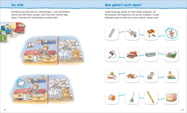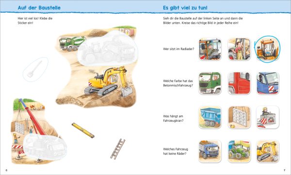 Planierraupe und Betonmischer, Traktor und Mähdrescher, Tanklaster und Sattelschlepper: Überall, wo es große Fahrzeuge zu bestaunen gibt, sind kleine Kinder nicht weit! Ganz spielerisch lernen sie mit diesem Mal- und Rätselheft Wissenswertes über die beeindruckenden Fahrzeuge und wofür sie eingesetzt werden. Abwechslungsreiche Aufgaben wie Logikrätsel, Labyrinthe und Suchbilder schulen genaues Hinsehen, Konzentration und Feinmotorik. Zusammen mit den großformatigen Ausmalbildern und den wieder ablösbaren Stickern sorgt dieses Buch bei Kindergartenkindern für lang anhaltenden Beschäftigungsspaß!