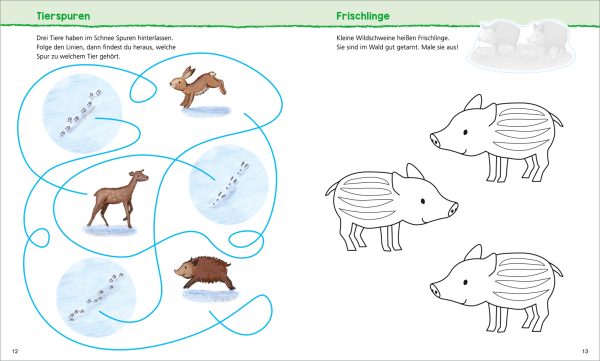 Zum Malen, Rätseln und Stickern lädt das 24-seitige Heft aus der Reihe "WAS IST WAS Kindergarten" ein. Im Wald gibt es viel zu entdecken: Bäume, Blätter, Früchte, Tiere laden zum Ausmalen ein. Genau hinschauen übt, wer das kleine Landschaftspuzzle spielen möchte. Geduld ist gefragt, um dem Wildschwein den Weg durchs Labyrinth zu zeigen. Aus Blättern kann man schöne Bilder kleben - schon mal ausprobiert? Welche Alltagsgegenstände sind aus Holz gemacht? "Im Wald" - ein wetterunabhängiger Spielspaß rund ums Jahr mit altersgerechten Ausmalbildern, spannenden Rätseln und wiederablösbare Stickern.