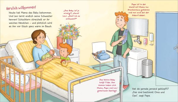 Endlich ist es soweit! Das lange Warten hat ein Ende und das neue Familienmitglied ist da! Jetzt sind sie zu viert - und Levi ist ein sehr stolzer großer Bruder! Das Baby muss gefüttert und gewickelt werden, und Levi kann helfen: Die stinkende Windel wirft er in den Müll. Und wenn das Baby weint, zieht er die Spieluhr auf. Als großer Bruder hat er viele tolle Aufgaben. Eine warmherzige Geschichte mit witzigen Illustrationen. Ein einfühlsames Vorlesebuch mit Klappen, die Spaß machen - für Kinder ab 2 Jahren.