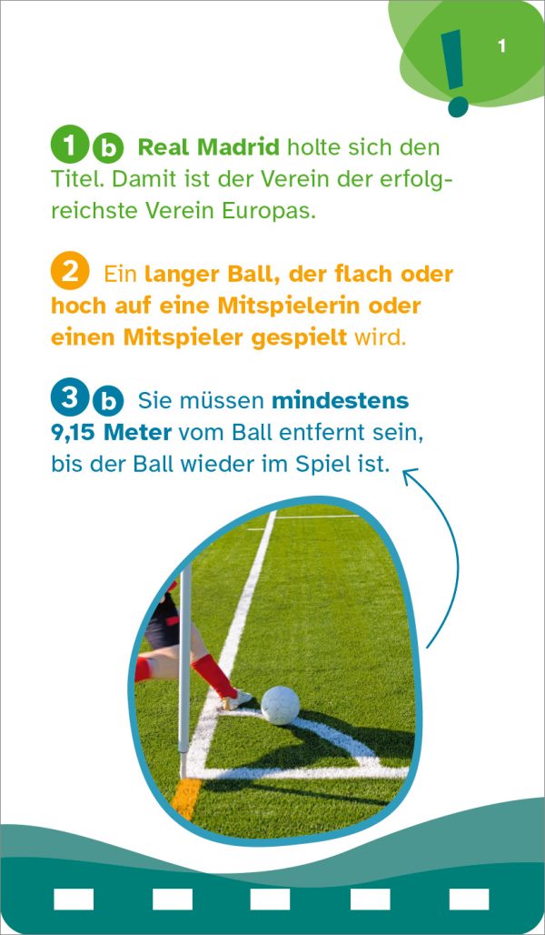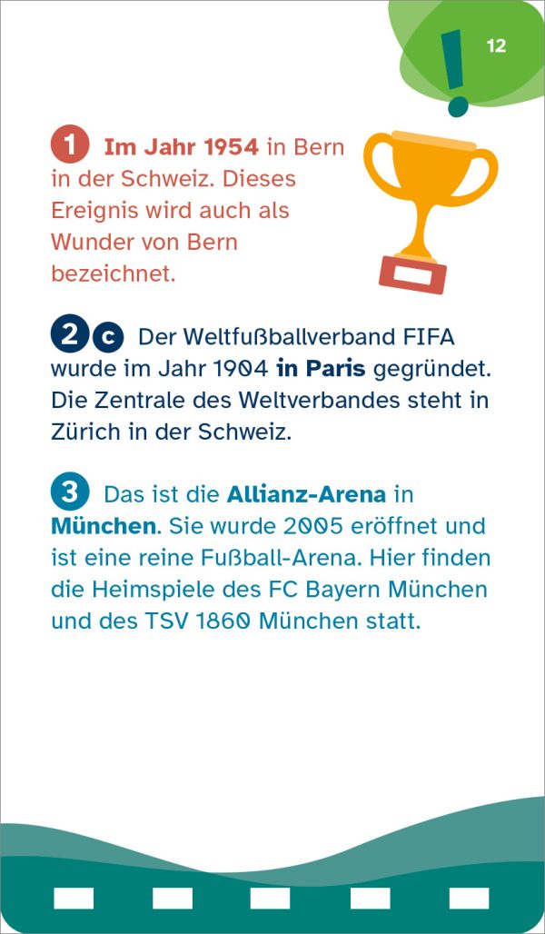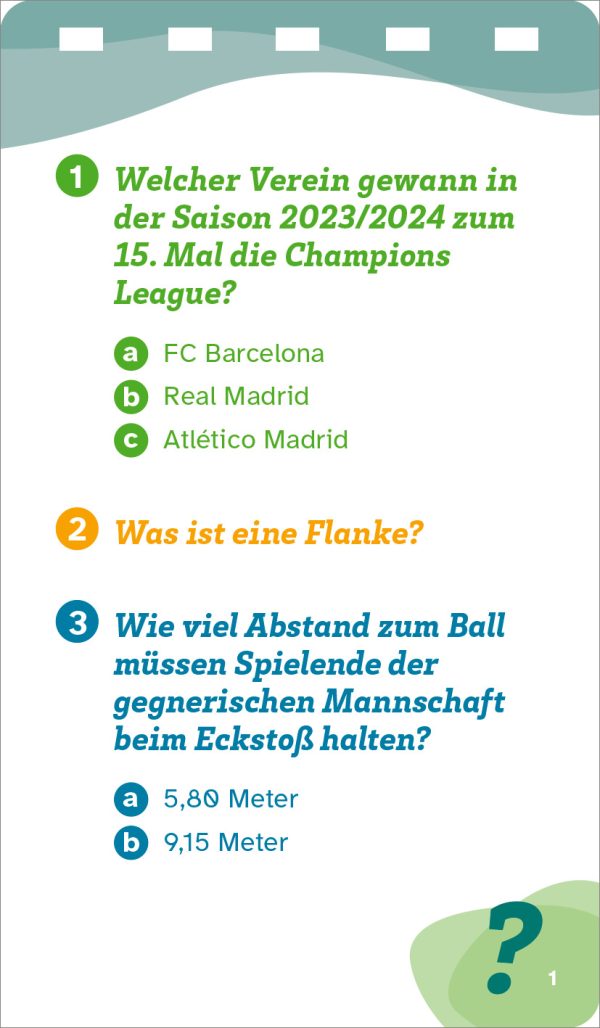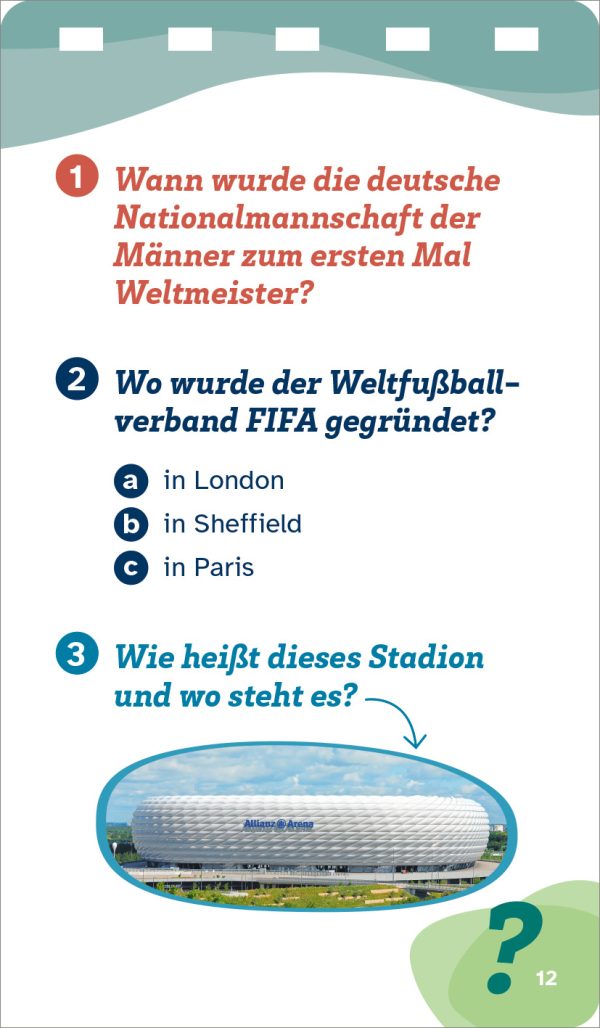Unterwegs, zu Hause, alleine oder in der Gruppe - die kleinen Quizblöcke sind wahre Unterhaltungswunder. Mit einer Menge Quizfragen kann man sich die Zeit unterwegs vertreiben oder lustige Quizrunden mit der Familie oder Freunden erleben. Wo ist der Fußball in seiner heutigen Form entstanden? Welche Aufgabe gehört nicht zum DFB? Wie oft wurde England Weltmeister? Der praktische Block liefert verblüffende Antworten auf spannende Fragen. Geeignet ab 8 Jahren.
