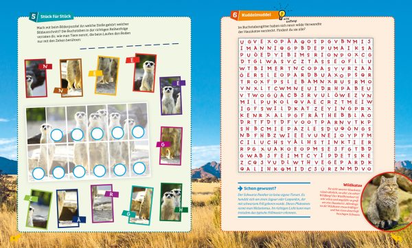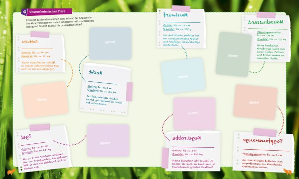 Auf zum tierischen Quiz! Wie schnell kann eine Giraffe laufen? Wie kommt die Knoblauchschildkröte zu ihrem Namen? Wo lauern Anakondas ihrer Beute auf? Viele unterschiedliche Rätsel führen Kinder ab 8 Jahren in die Welt der Tiere ein. Es wird der verschlungene Weg des Pandas durchs Labyrinth erforscht, Lieblingsfutter zugeordnet und jeder der tollen Sticker exakt dem entsprechen Steckbrief des heimischen Tieres zugeordnet.