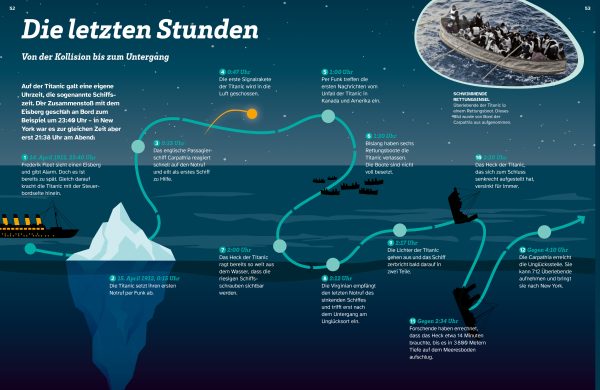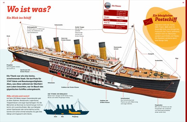 Mit beeindruckenden Bildern erkunden die Kinder das berühmte Schiffswrack. Anschaulich und packend erzählt das Buch die dramatischen Ereignisse rund um die Jungfernfahrt des Ozeanriesen – von der Konstruktion in Belfast bis zum Zusammenstoß mit dem Eisberg im Nordatlantik. Warum galt sie als unsinkbar? Wer war an Bord des Schiffs? Was geschah in der Nacht des 14. Aprils? 1985 wurde das Wrack der Titanic von Robert Ballard entdeckt. Seitdem erforschen Wissenschaftlerinnen und Wissenschaftler mit modernster Technik die Überreste des Schiffs. Tauchroboter, Spezialkameras und Tiefsee-U-Boote liefern immer neue Erkenntnisse über den Unglückshergang.